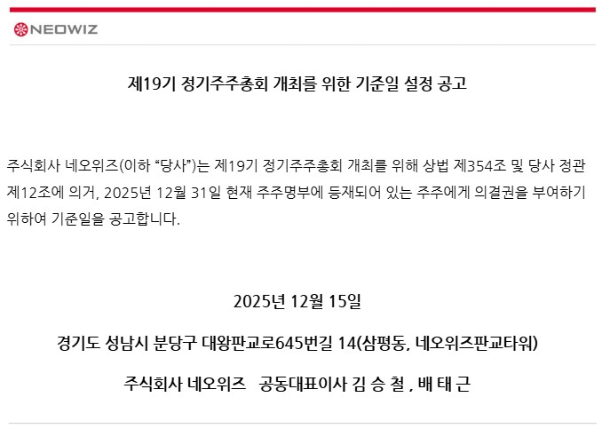 제19기 정기주주총회 개최를 위한 기준일 설정 공고