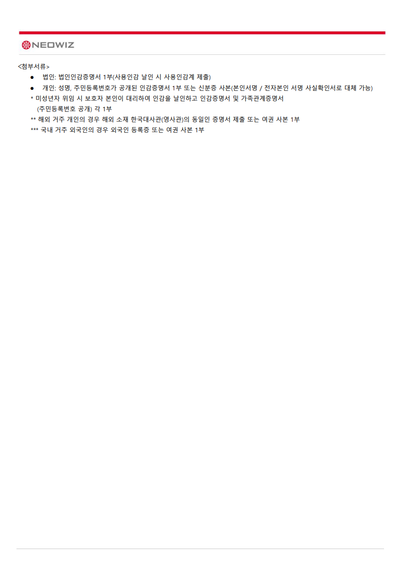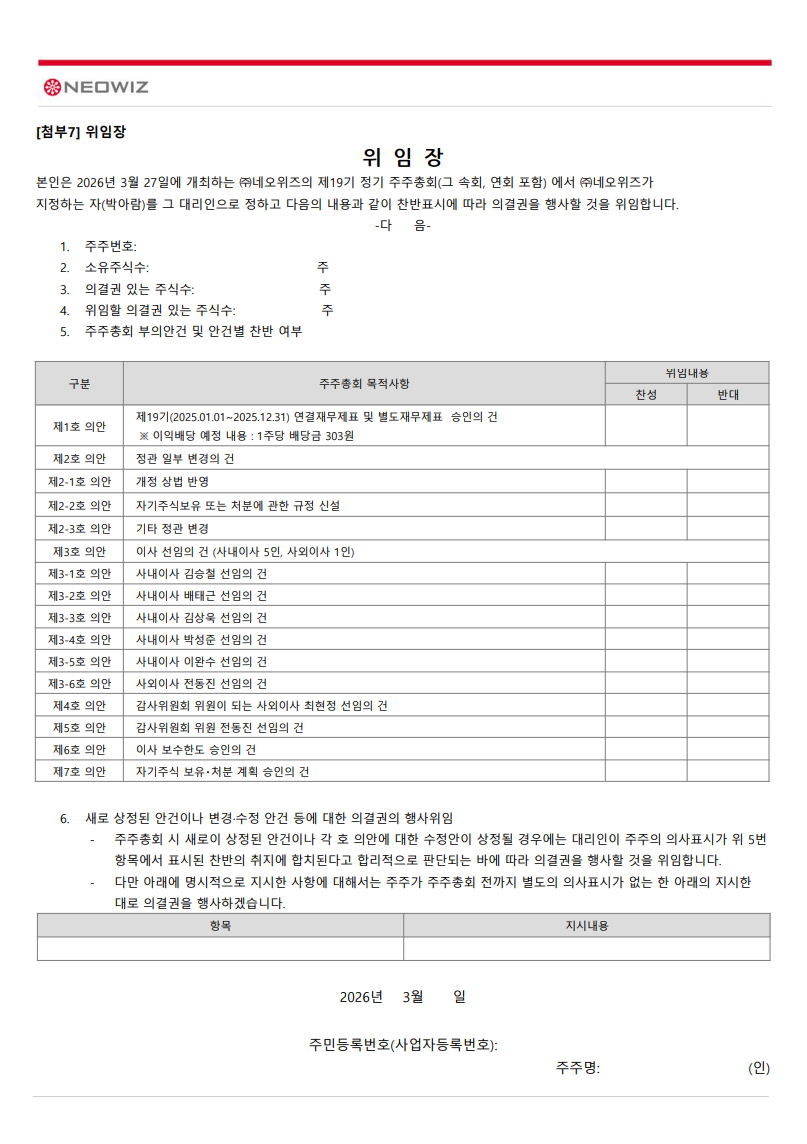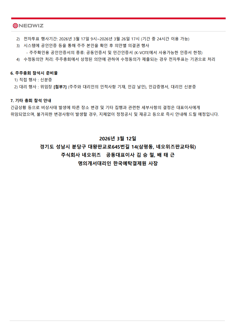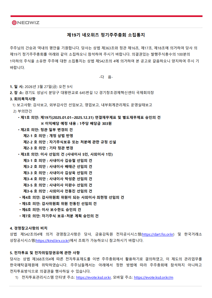 제19기 네오위즈 정기주주총회 소집통지 공고