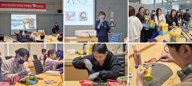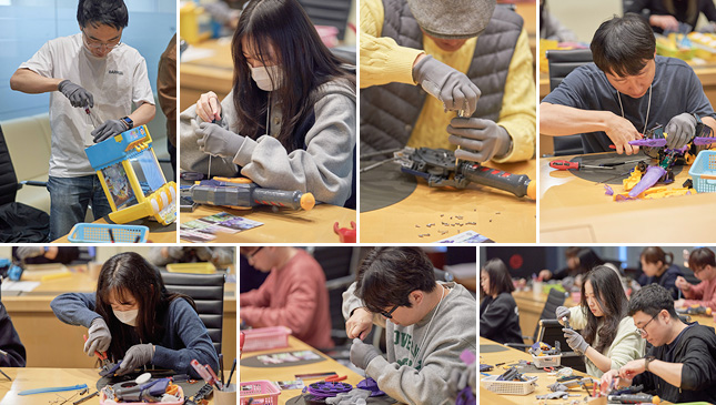 활동에 준비된 재사용 불가한 폐장난감이 똑같은 것들이 많아서 의아했는데, 폐장난감은 소비자들이 기부하는 것도 있지만 업체에서 불량으로 회수하는 것들도 많다고 합니다. 플라스틱 재활용을 위해서는 복합물질로 된 장난감을 분해하는 작업이 필요합니다. 장난감은 전원을 넣으면 소리가 나기도 하고, 움직이거나 불빛이 반짝이는 동작을 하는 것들이 많은데요. 드라이버와 니퍼 등을 이용하여 모두 분해하고 플라스틱, 전자부품, 나사 및 스프링 등의 쇠, 고무, 전자부품 등으로 분리를 해줍니다. 오래되어 기름이 흘러나와 있거나 나사에 녹이 슬어 있기도 하지만 분리하는 작업 자체가 어렵지는 않습니다. 간혹 드라이버 사용이 불가한 특수한 나사로 된 부분들도 있는데 이런 경우에는 기계로 깨트려서 분리하기도 한다고 합니다. 분해한 플라스틱은 업사이클 제품의 재료로 활용이 되고, 일부는 청소년들의 환경교육을 위해 사용이 되기도 합니다. 2026년부터는 플라스틱 장난감도 '생산자책임재활용제도'에 포함되어 기존의 플라스틱류와 함께 제조·수입·판매업자가 일정량을 수거해 재활용을 해야 한다고 합니다. 꼭 필요한 것만 구입하고 최대한 재활용이 가능하게 분리 배출할 수 있도록 관심을 기울여야겠습니다.
