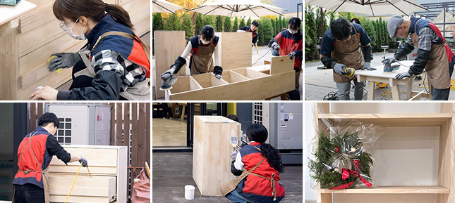 이번 오색오감 '목공' 활동에는 특별한 일이 하나 있었습니다. 꽃을 이용해 다양한 활동을 하고 있는 네오위즈의 '이달의 꽃' 동호회 회원분들이 가구와 함께 선물할 크리스마스 리스를 만들어 기부해 주셨습니다. 눈이 펑펑 내리던 날 각 가정에 맞춤 가구와 함께 리스를 전해드렸는데요. 가정에서 직접 받으시는 분들이 기뻐해 주시고 손을 꼭 잡고 연말 기분 난다고 말씀해 주신 것이 무척 감동이었고, 서로 마음을 주고받는 소중한 시간이 되었습니다.