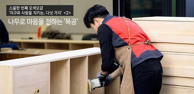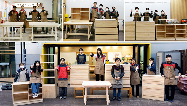 '오색오감' 중 신청자 모집이 가장 빨리 마감되는 활동이 '목공'입니다. 모집 인원수가 적은 이유도 있겠지만, 평소에 가구를 직접 만들어보고 싶다거나 은퇴 이후에 목공일을 해보고 싶다고 생각하는 분들이 많은듯합니다. 쓰임에 딱 맞게, 공간에 딱 맞게 원하는 대로 세상에 하나밖에 없는 가구를 만드는 것은 아주 매력적인 일입니다. 오색오감 '목공' 나눔은 사회 취약계층 가정의 생활환경 개선을 위해 맞춤 가구를 만들어 기부를 하는 활동입니다. 이번에는 네 번에 걸쳐 열 개의 가정에 기부할 열 개의 가구를 만들었습니다.