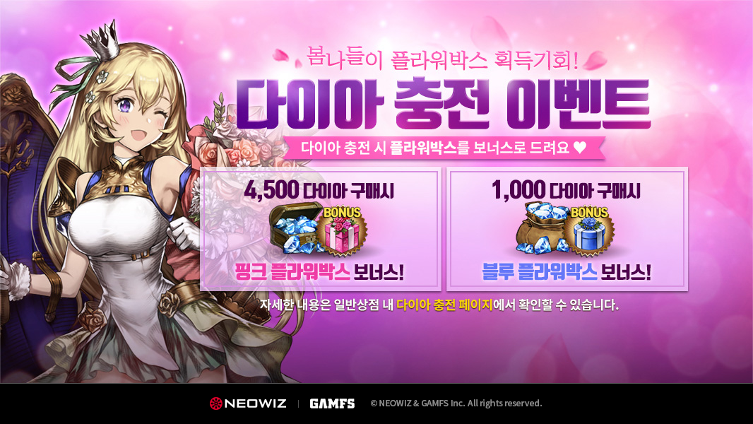한편, 신규 5성 마법형 용병 ‘헬가’의 외전 스토리가 추가되었으며, 이 외에도 봄을 맞이해 4월 2일까지 다이아를 충전하면 랜덤 확률로 5성 스킬북, 5성 용병 랜덤권, 5성 스킬 전수권 등 각종 인기 아이템을 추가로 획득할 수 있는 ‘봄나들이 플라워박스’ 프로모션과, 5성 지원형 ‘플로리아’를 획득할 수 있는 조각미션 이벤트도 함께 진행된다.