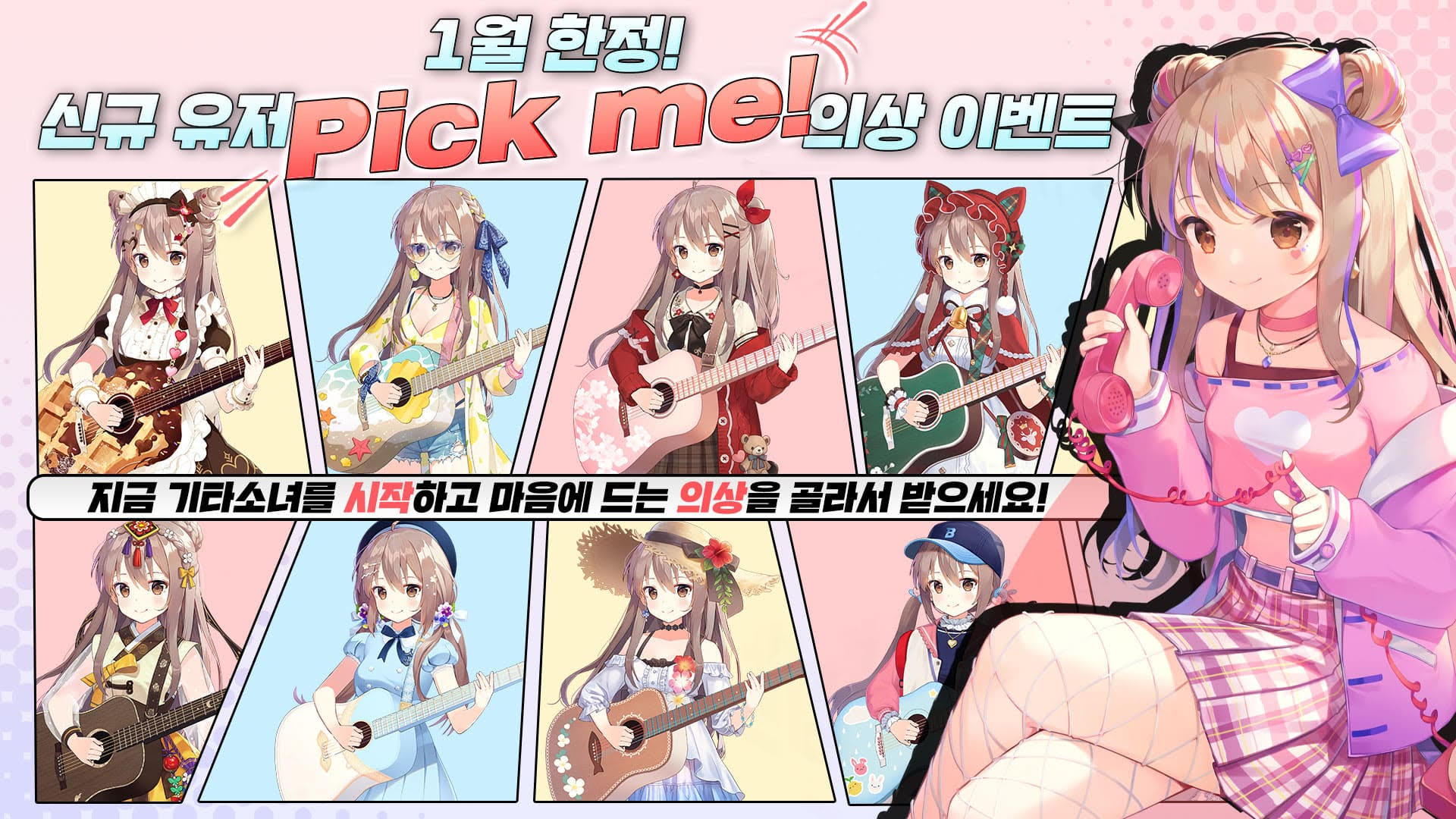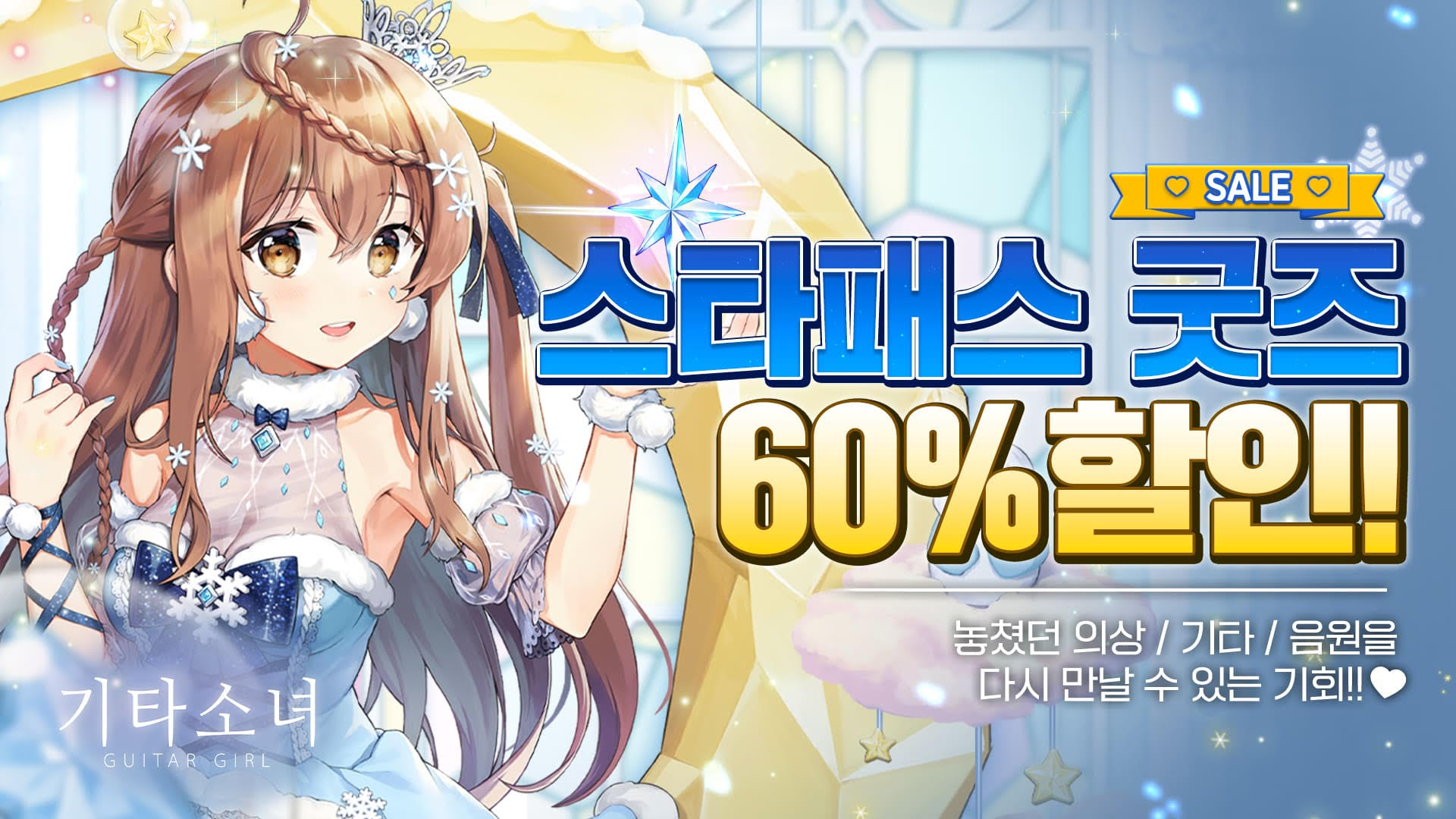 모바일 힐링 클리커 게임 ‘기타소녀’는 오는 2월 6일까지 신규 이용자에게 스타패스 한정 의상과 기타 중 선택한 1종을 무료로 제공한다. 또, 게임 내 한정 의상, 기타, 음원들을 받을 수 있는 ‘스타패스 굿즈’를 60% 할인된 가격으로 판매한다.