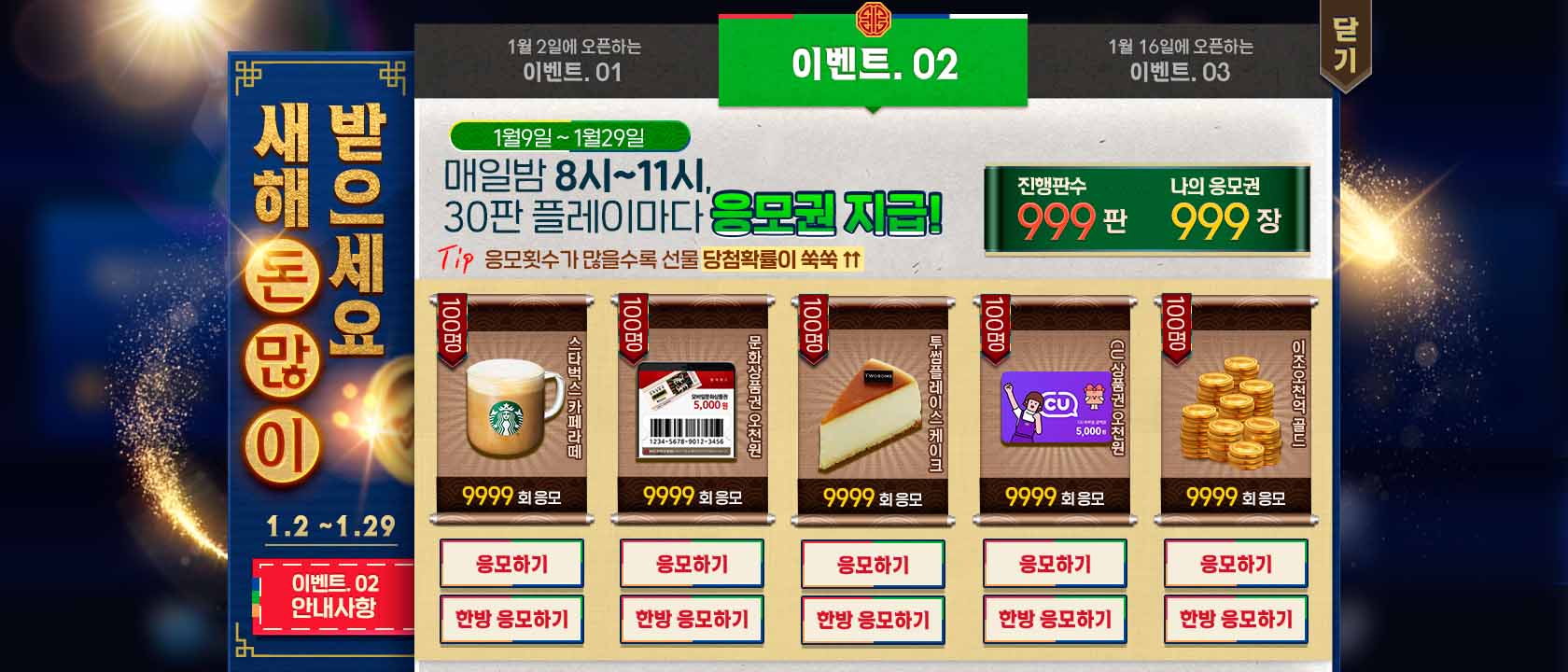 웹보드 게임도 푸짐한 경품을 지급하는 이벤트를 진행한다. 먼저, ‘피망 뉴맞고’는 오는 2월 12일까지 ‘설날플러스’ 상품을 구매 시 10일 동안 게임 재화를 증정하며 블랙, 비단 등 기간제 레어 화투패를 추가로 제공한다. ‘피망 포커’와 ‘피망 섯다’는 오는 29일까지 새해 한정 경품 응모 이벤트를 진행, 매일 오후 8시부터 11시까지 30판 플레이 시 응모권을 지급한다. 제공된 응모권을 활용해 ‘커피 기프티콘’, ‘문화상품권’, ‘게임 재화’ 등 푸짐한 보상으로 교환할 수 있다.