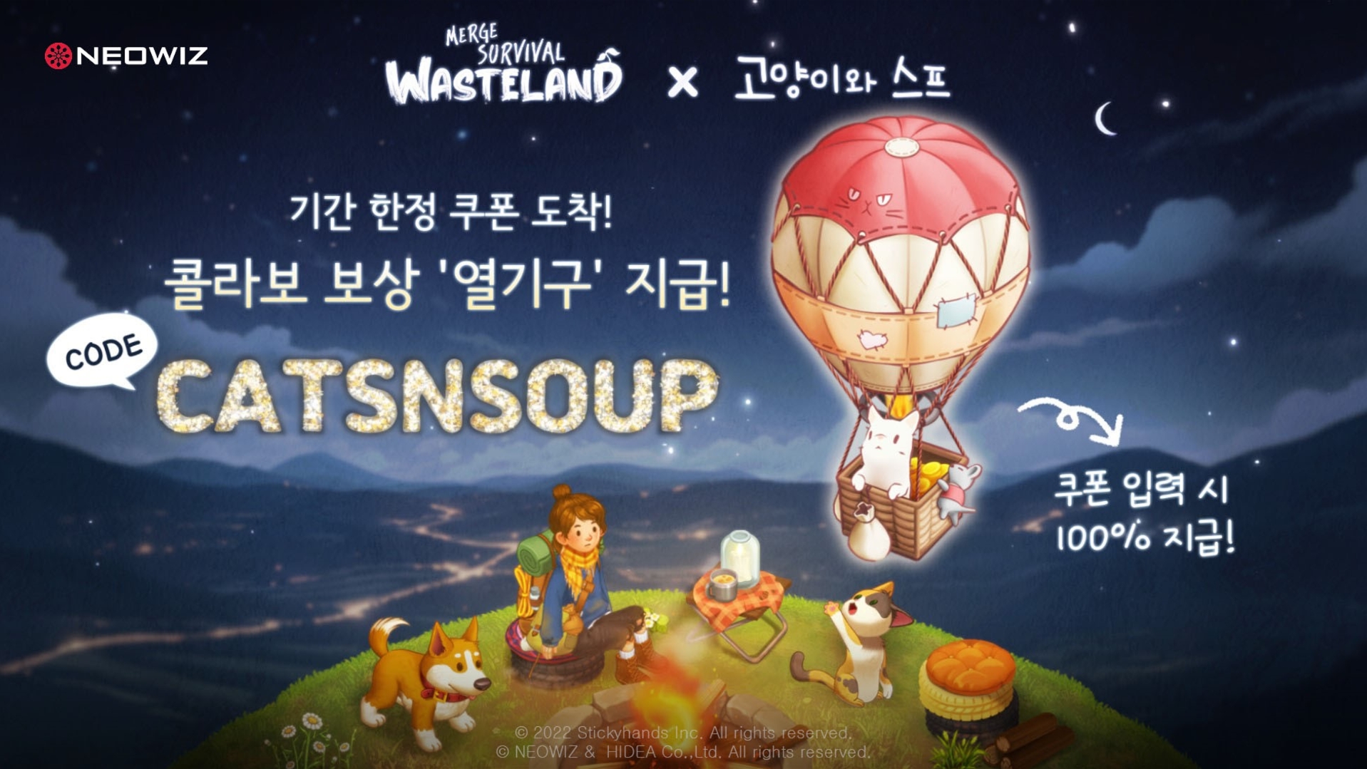 [2025-0304] ㈜네오위즈(공동대표 김승철, 배태근)는 자회사 ㈜스티키핸즈(대표 김민우)가 개발한 ‘머지 서바이벌 : 생존의 땅(이하 머지 서바이벌)’이 힐링 모바일 방치형 게임 ‘고양이와 스프’와 콜라보 업데이트를 진행했다고 4일 밝혔다.